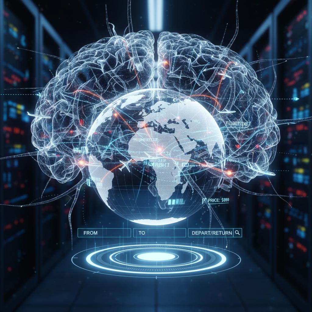 Alt text: Stylized neural network over flight data streams, AI flight search recommendation engine interface.