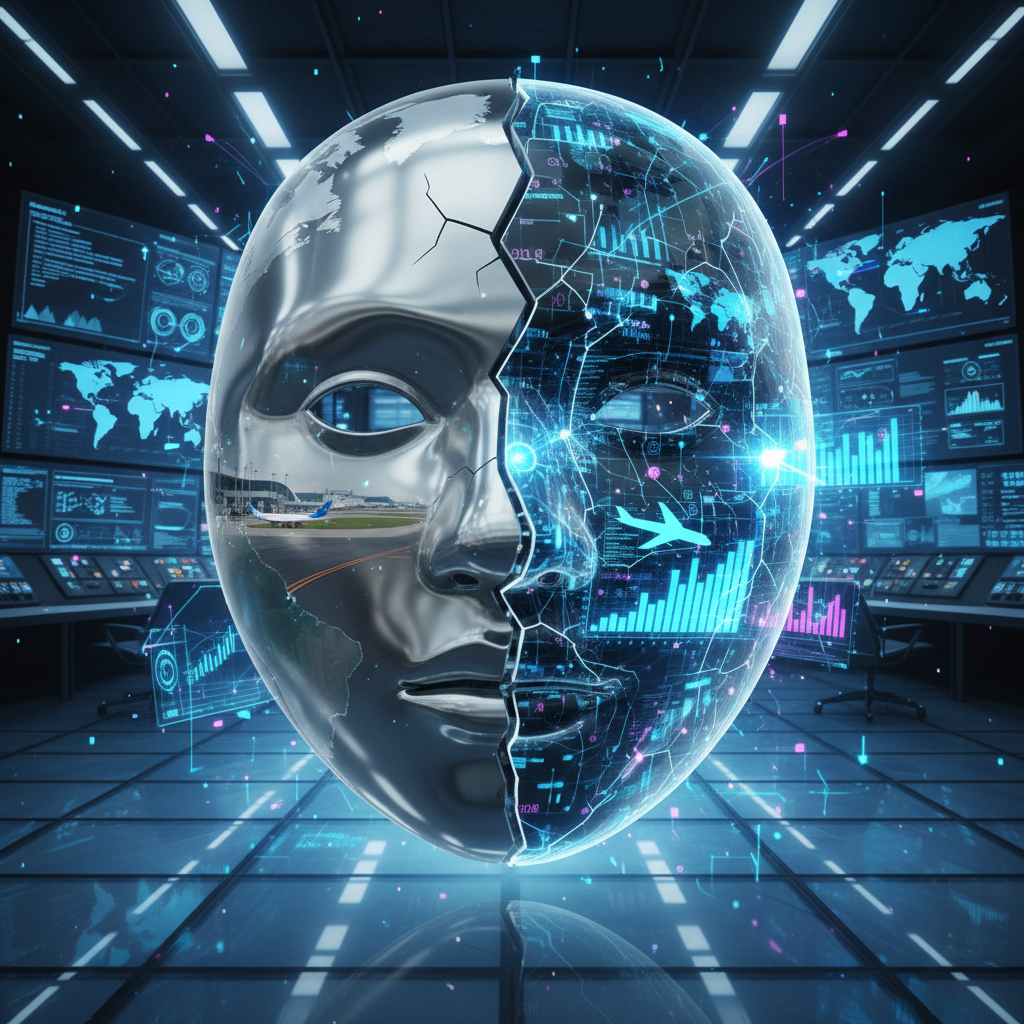 Airfare data analysis image: Mask splits open to reveal digital streams behind airline pricing.
