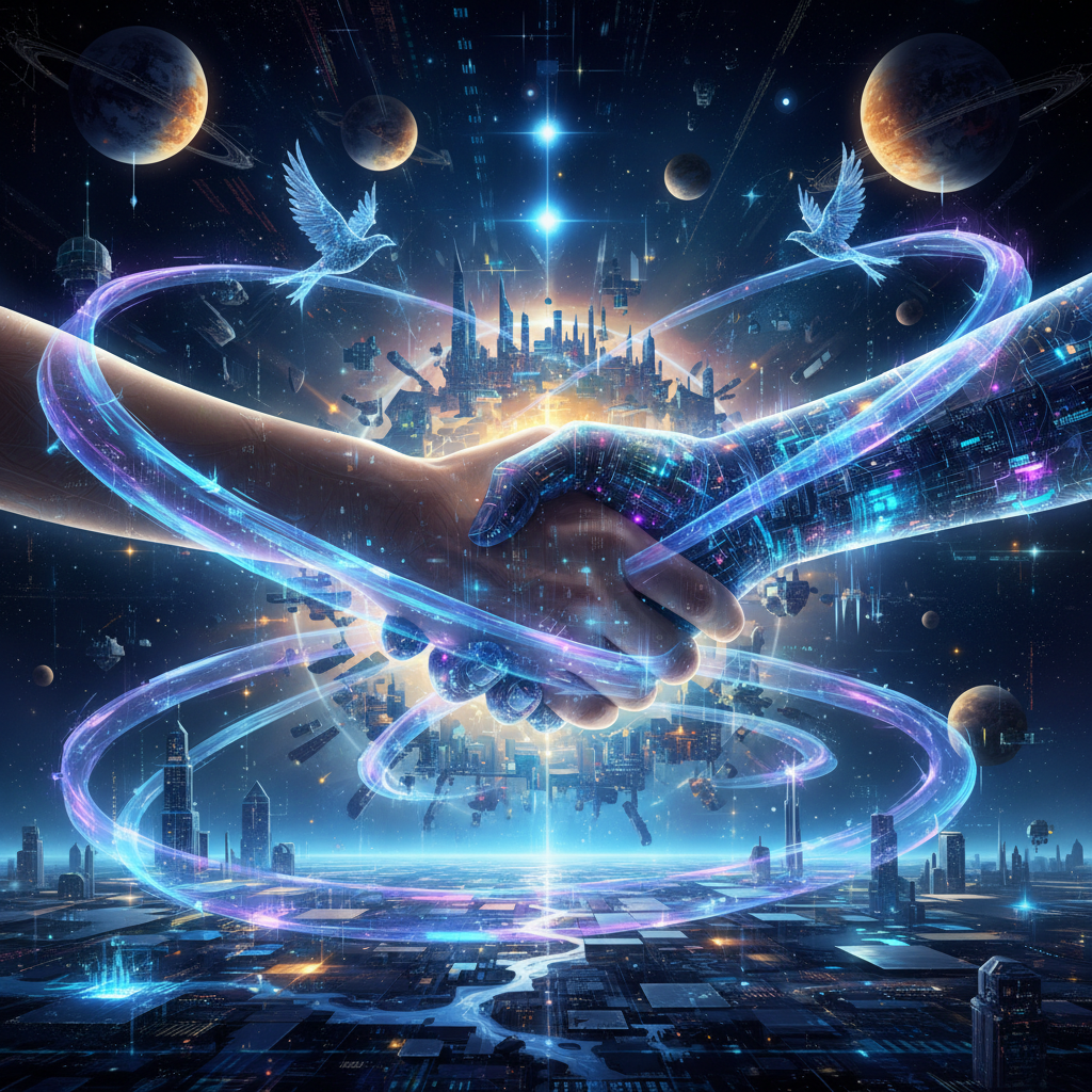 Symbolic, slightly surreal image of human and AI hands shaking over a grid of digital flight paths, 16:9, high contrast.