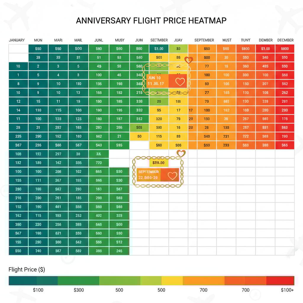 Alt text: Heatmap showing dynamic flight price spikes around popular anniversary dates, anniversary trip flights.