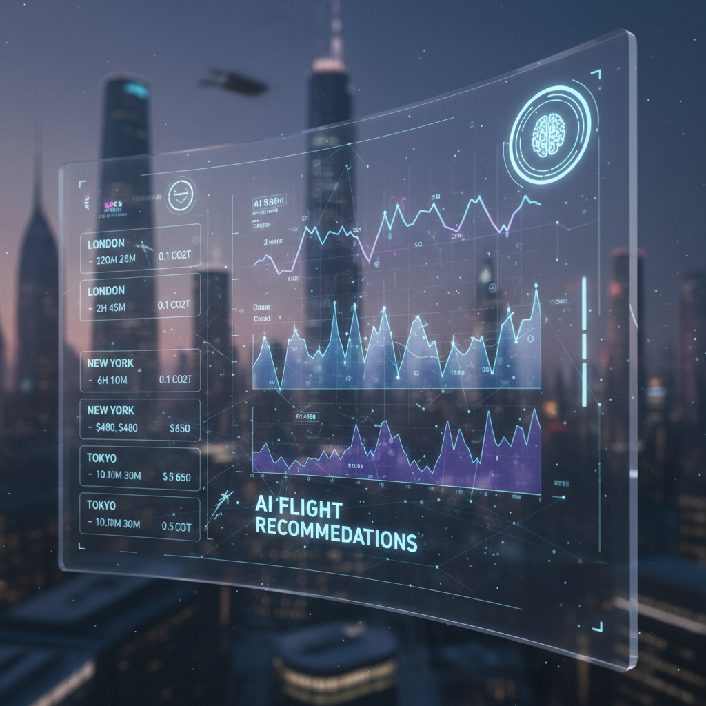 Alt text: Futuristic digital dashboard displaying AI-generated balanced flight recommendations and live graphs