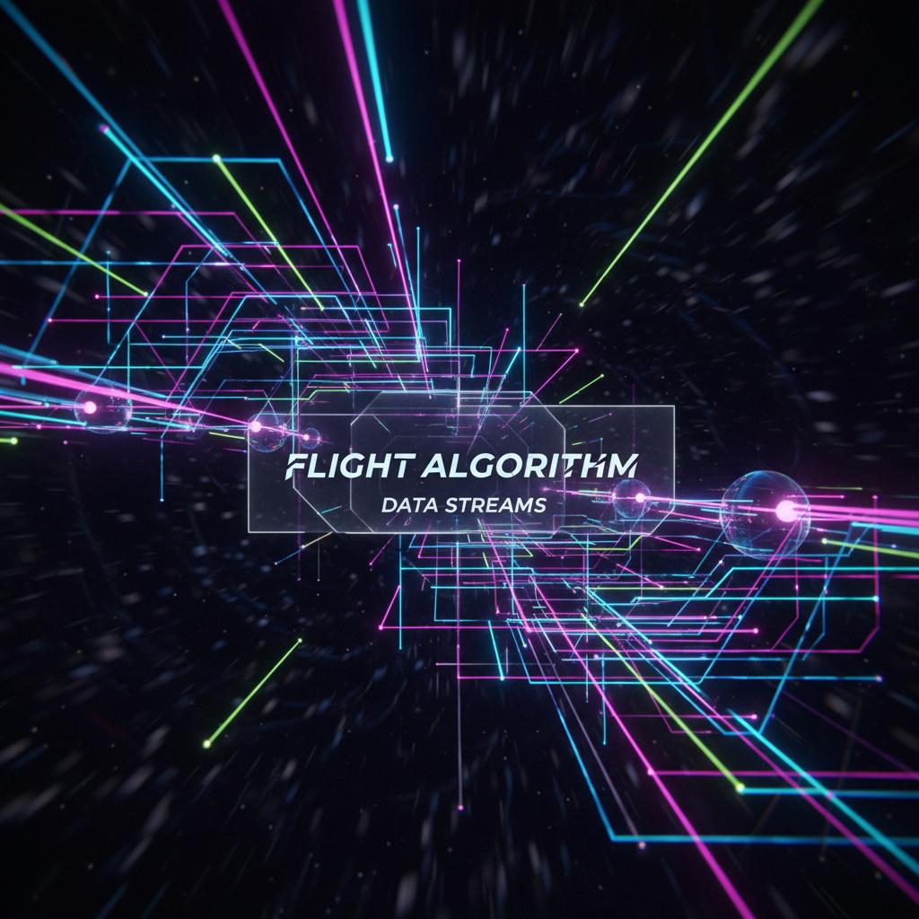 Alt text: Flight search algorithms visualized as neon data streams flowing through digital pathways.