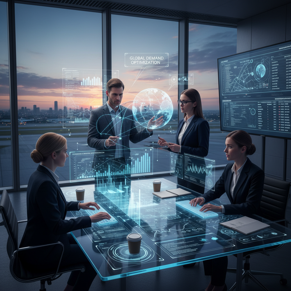 Alt text: Airline analysts in a futuristic control room monitoring screens with dynamic flight pricing models and algorithms, best days to buy flights theme.