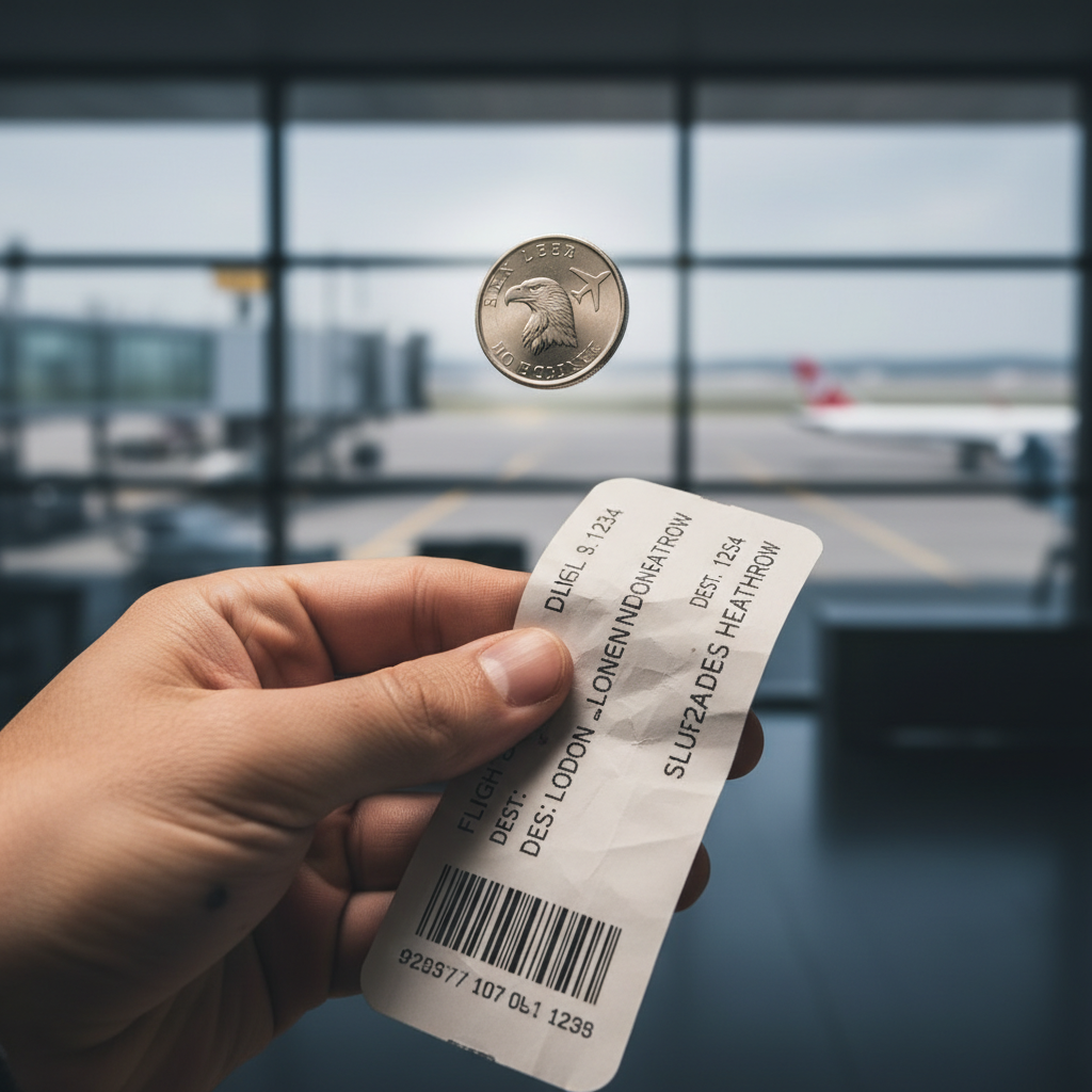 Image: Coin toss overlaid on a boarding pass; Alt: Symbolic image representing luck in flight bookings.