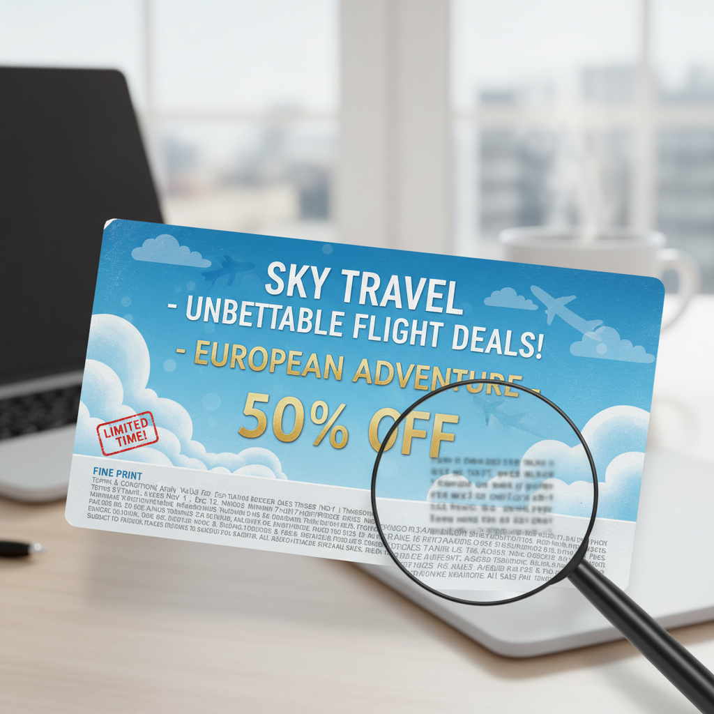 Image: Close-up of fine print on a flight offer; Alt: Small print details on a first class ticket offer.