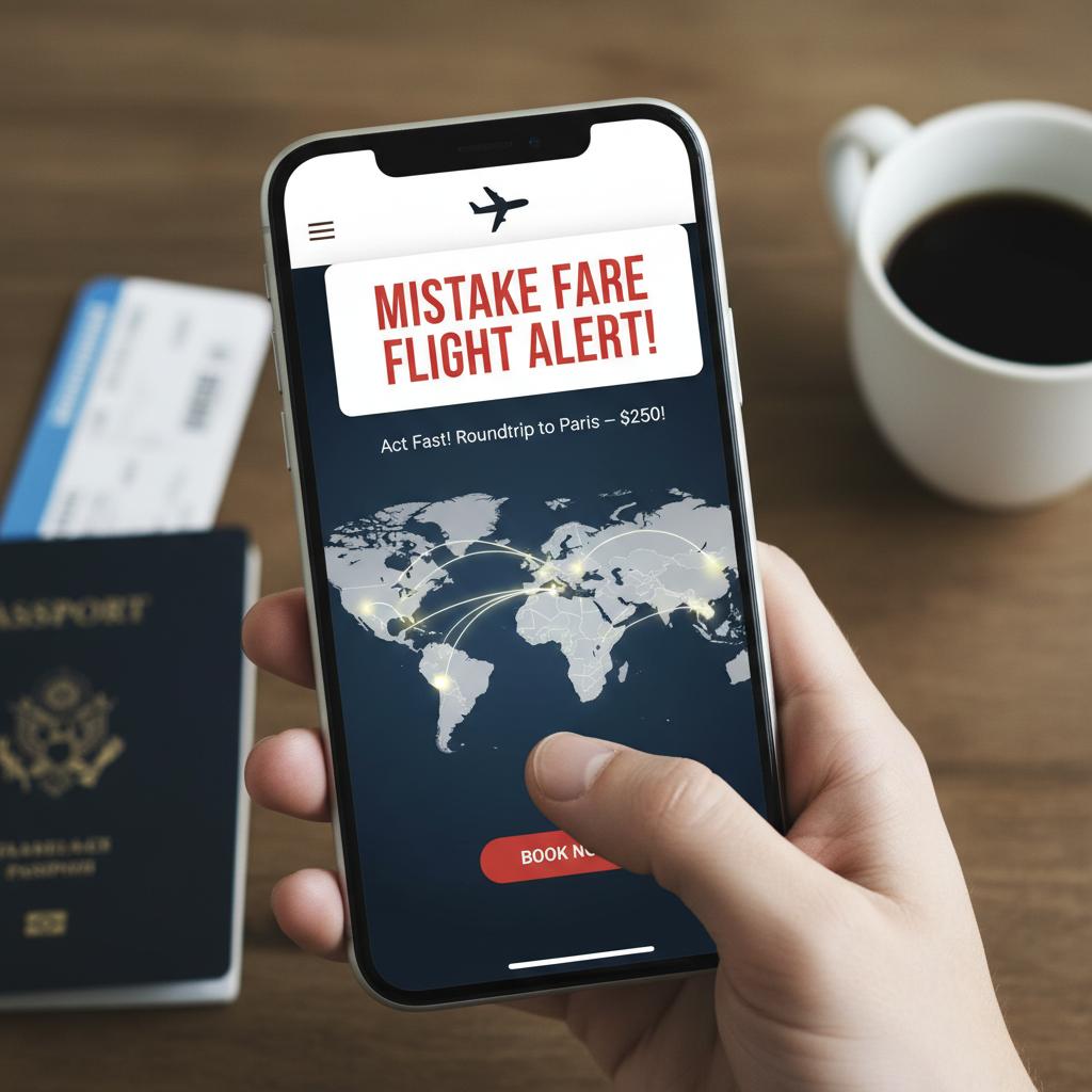 Image: Smartphone showing a flight alert for a mistake fare; Alt: Surprise notification about a mistake fare on a flight app.