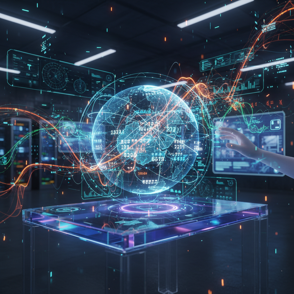 Alt: Photo of a futuristic computer interface overlaying a flight calendar with glowing data streams, representing AI in flight search