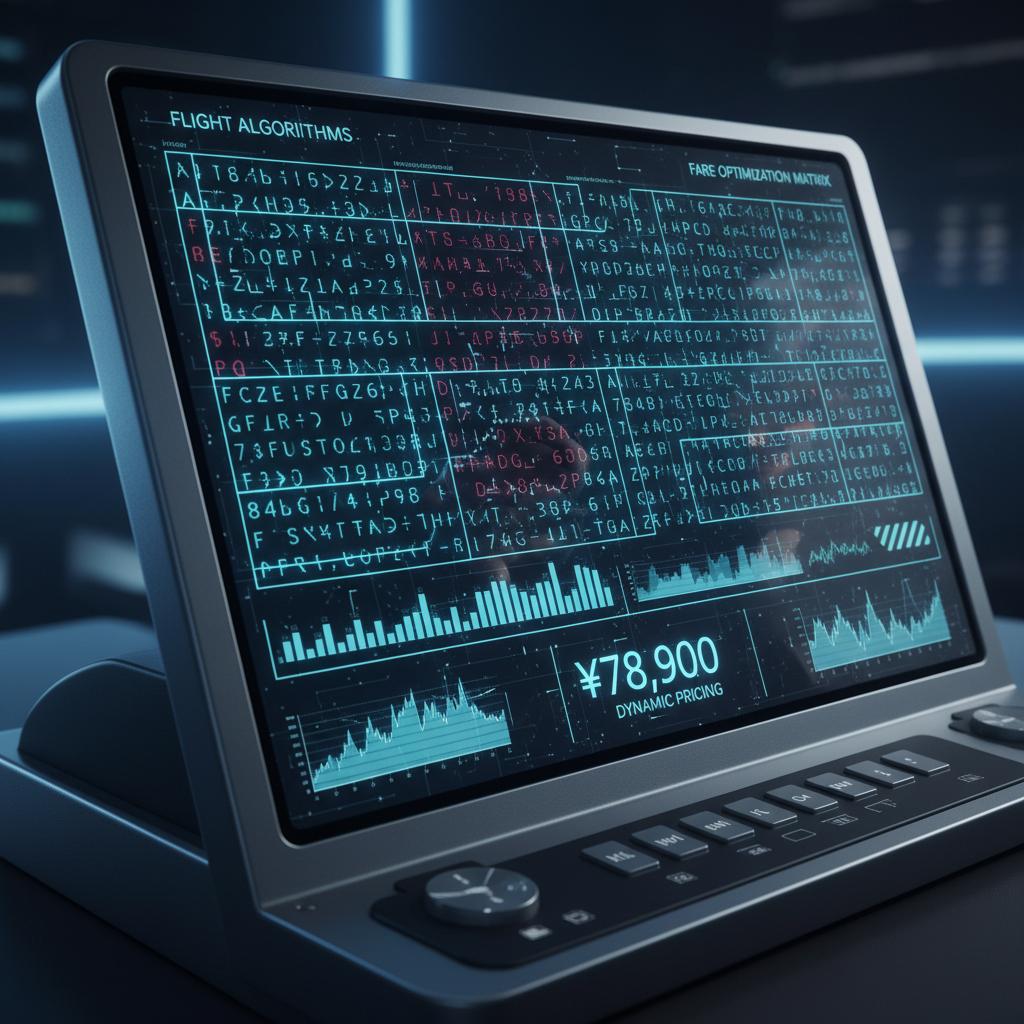 Stylized close-up of an airline fare algorithm on a digital screen, overlaid with cryptic numbers; high-tech, moody, professional