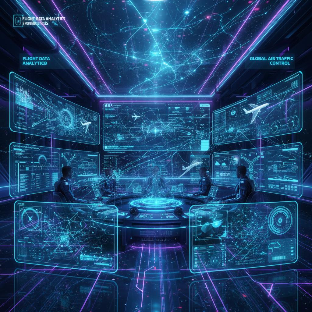 Alt text: AI algorithms visualized as neon-lit code streams overlaying a flight map, representing flexible date search engines.