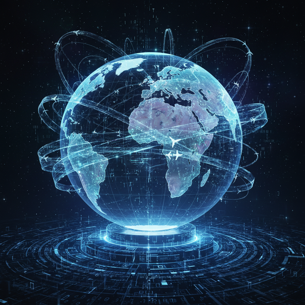 Alt text: Stylized data streams overlay a world map with flight routes, representing flight booking predictive analytics powered by global data.