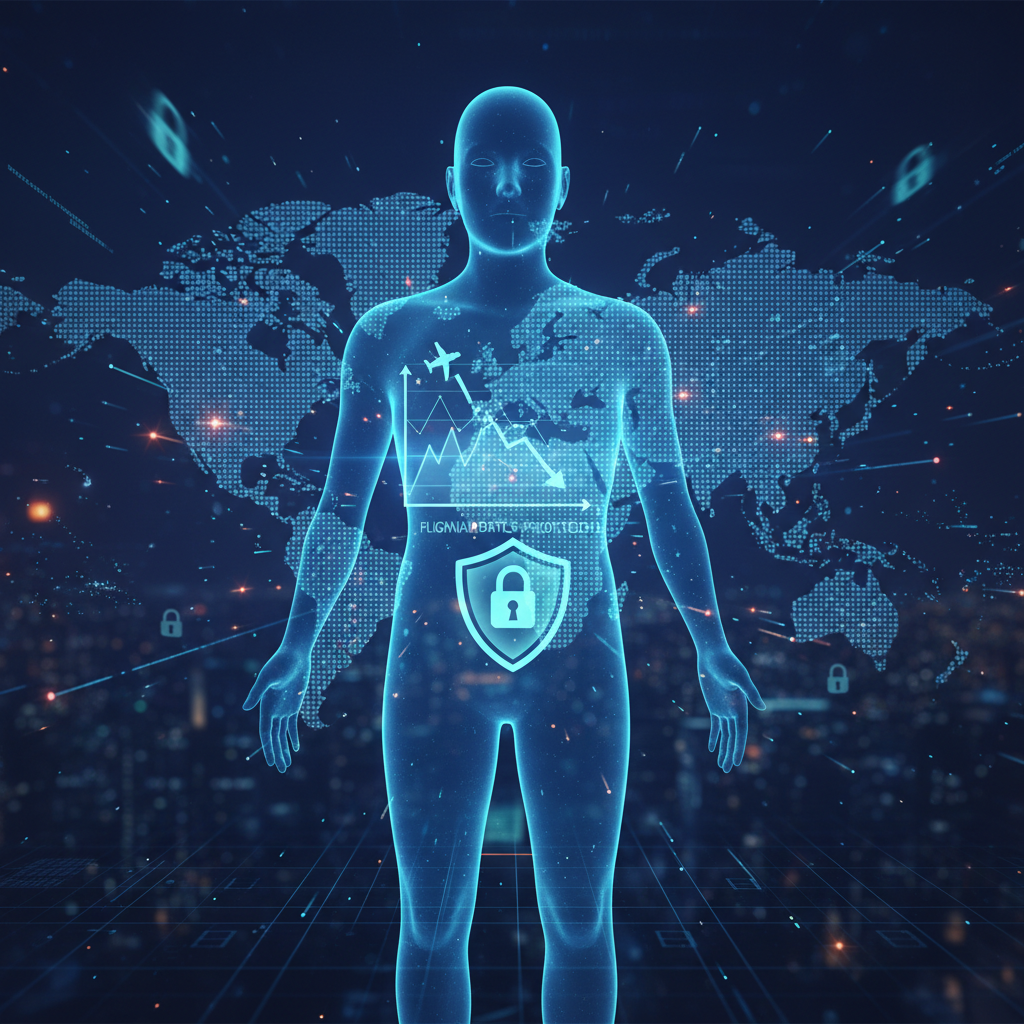 Alt: Symbolic image of a traveler’s digital shadow cast across a glowing flight price chart, highlighting data privacy risks with tracking apps.