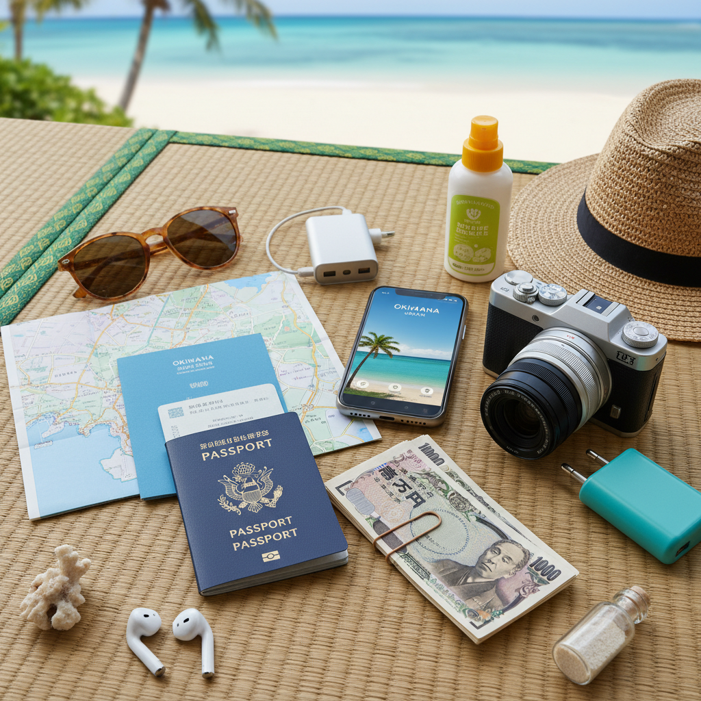 Photo: Flat lay of travel documents and gadgets on Okinawa-themed background. Alt: Travel essentials for departing Okinawa laid out neatly on a table.