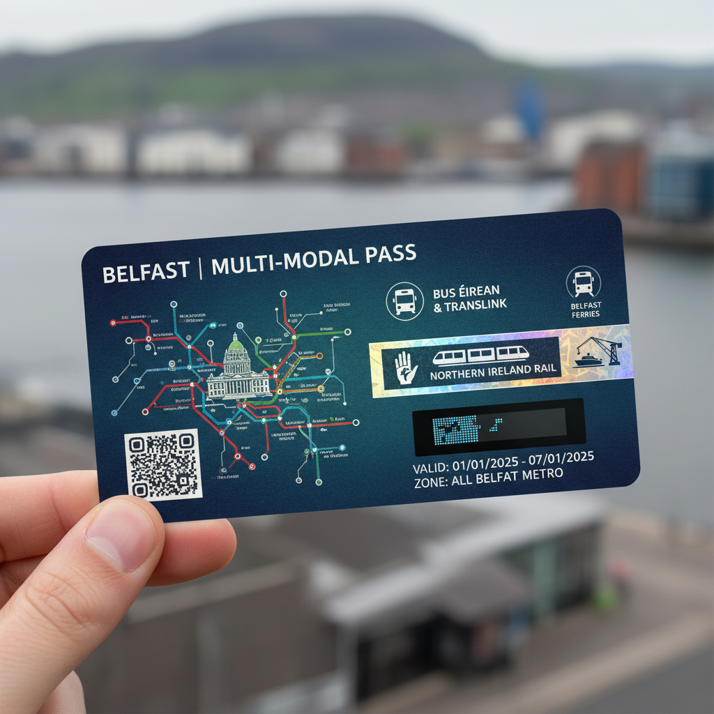 Alt: Collage of plane, train, and ferry tickets for Belfast, illustrating combined travel modes.
