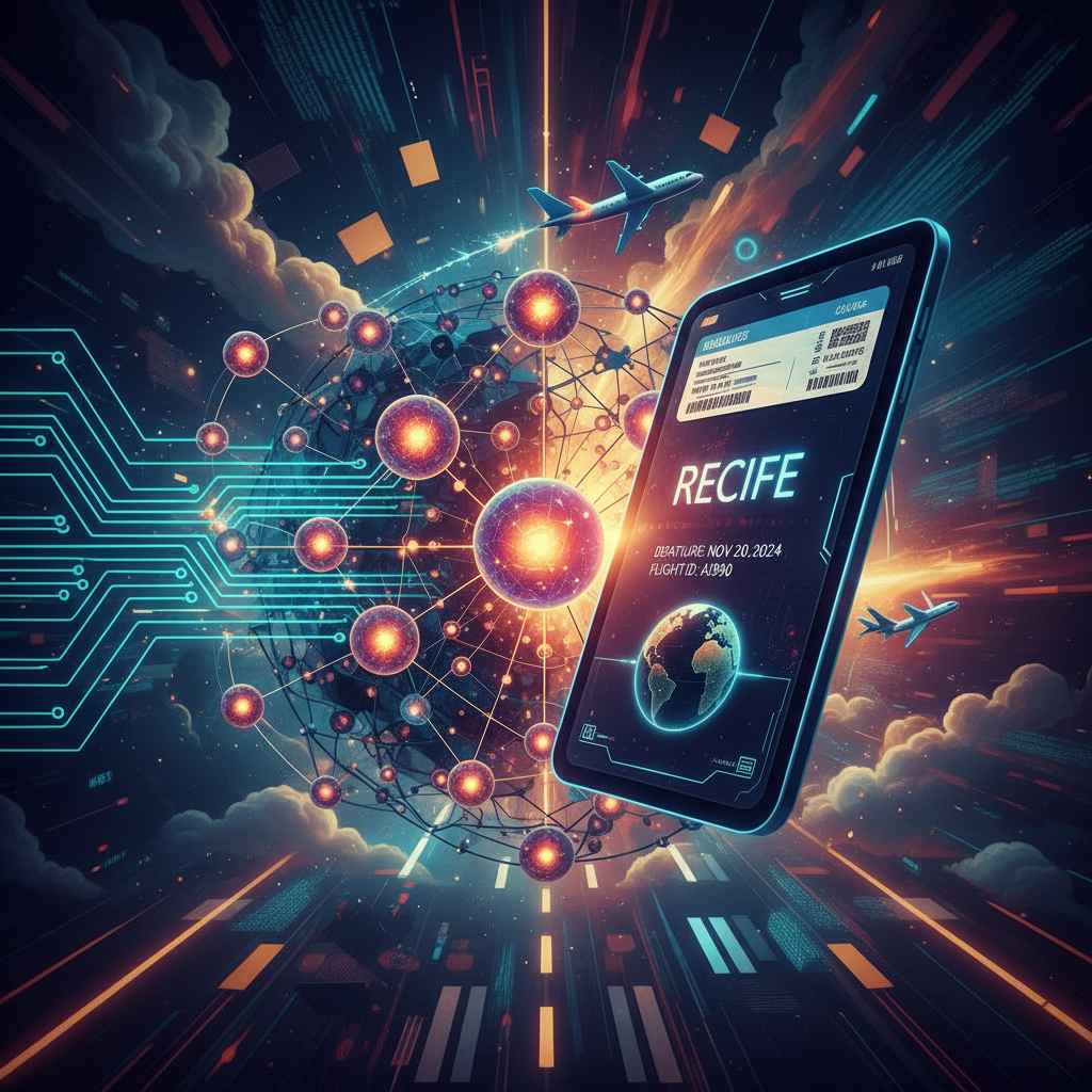 Stylized photo: The neural network “brain” behind intelligent flight search, highlighting Recife as a destination.