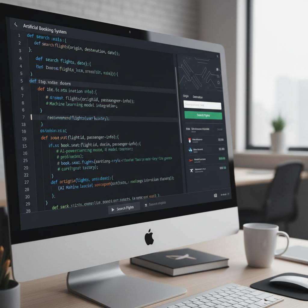 Alt text: Photo of a futuristic AI-powered flight booking interface showing real-time, predictive travel suggestions, symbolizing the cutting edge of booking technology.