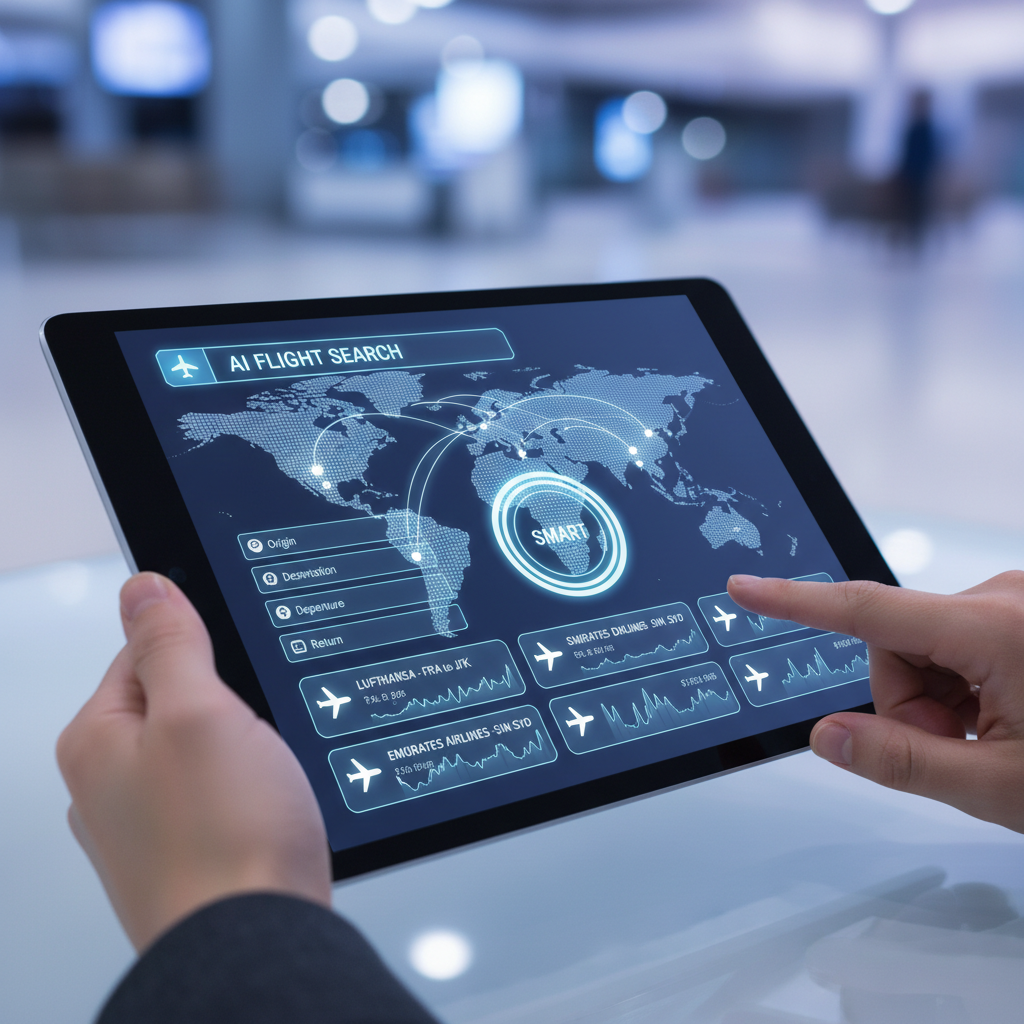 Futuristic digital interface with AI-driven flight recommendations on a tablet.