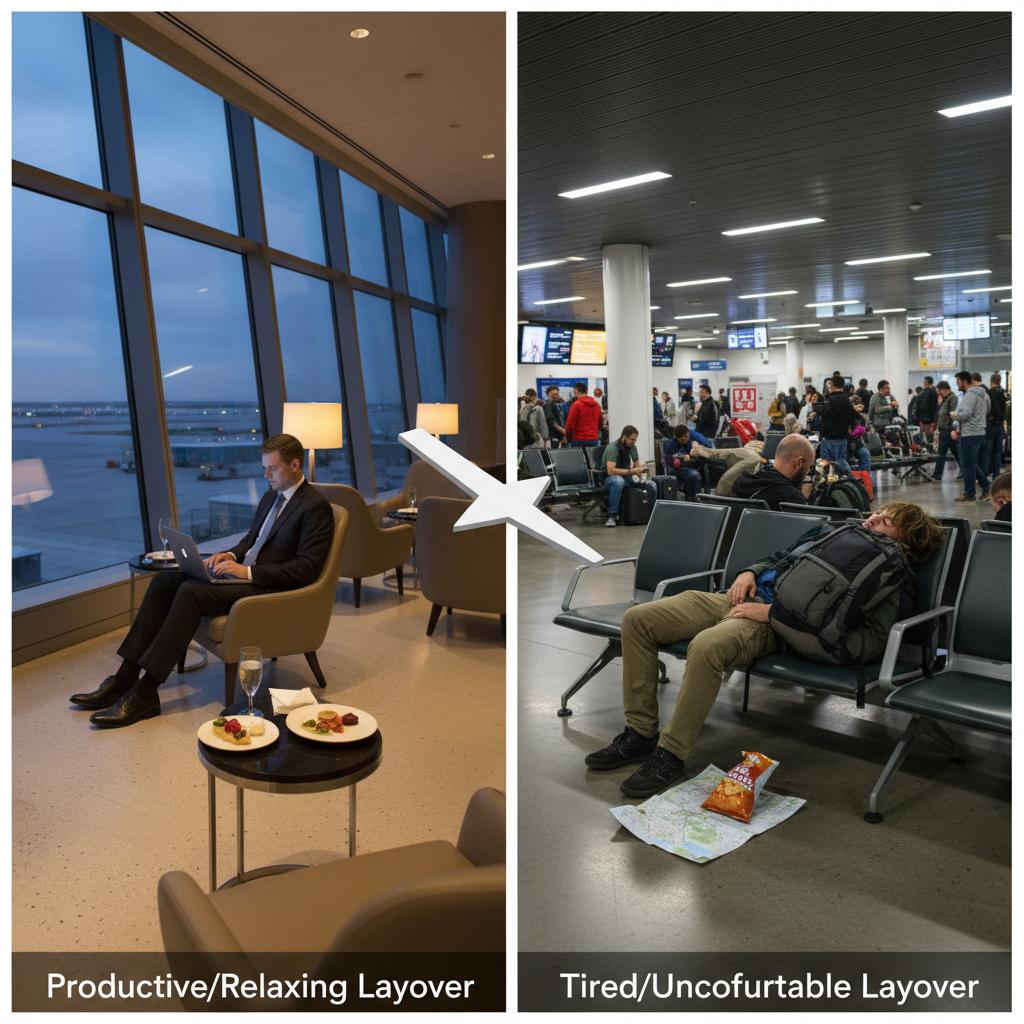 Alt text: Contrasting airport scenes showing various layover types, from crowded transfer areas to luxury lounges