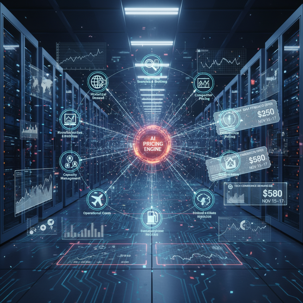 Alt text: AI algorithms dynamically determining airline prices for low-cost airlines search.