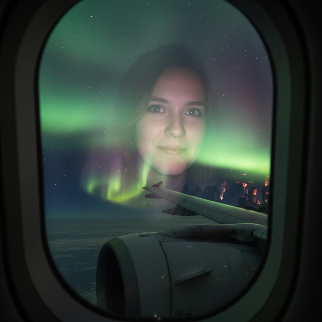 Passengers in awe as an aurora bursts outside the plane window—memory, wonder, and once in a lifetime flights.