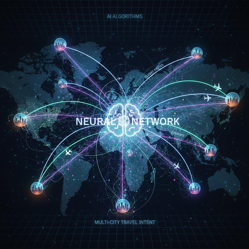Alt: AI algorithms mapping multi-city travel intent using neural network graphics and flight paths, plan multi-city trips easily
