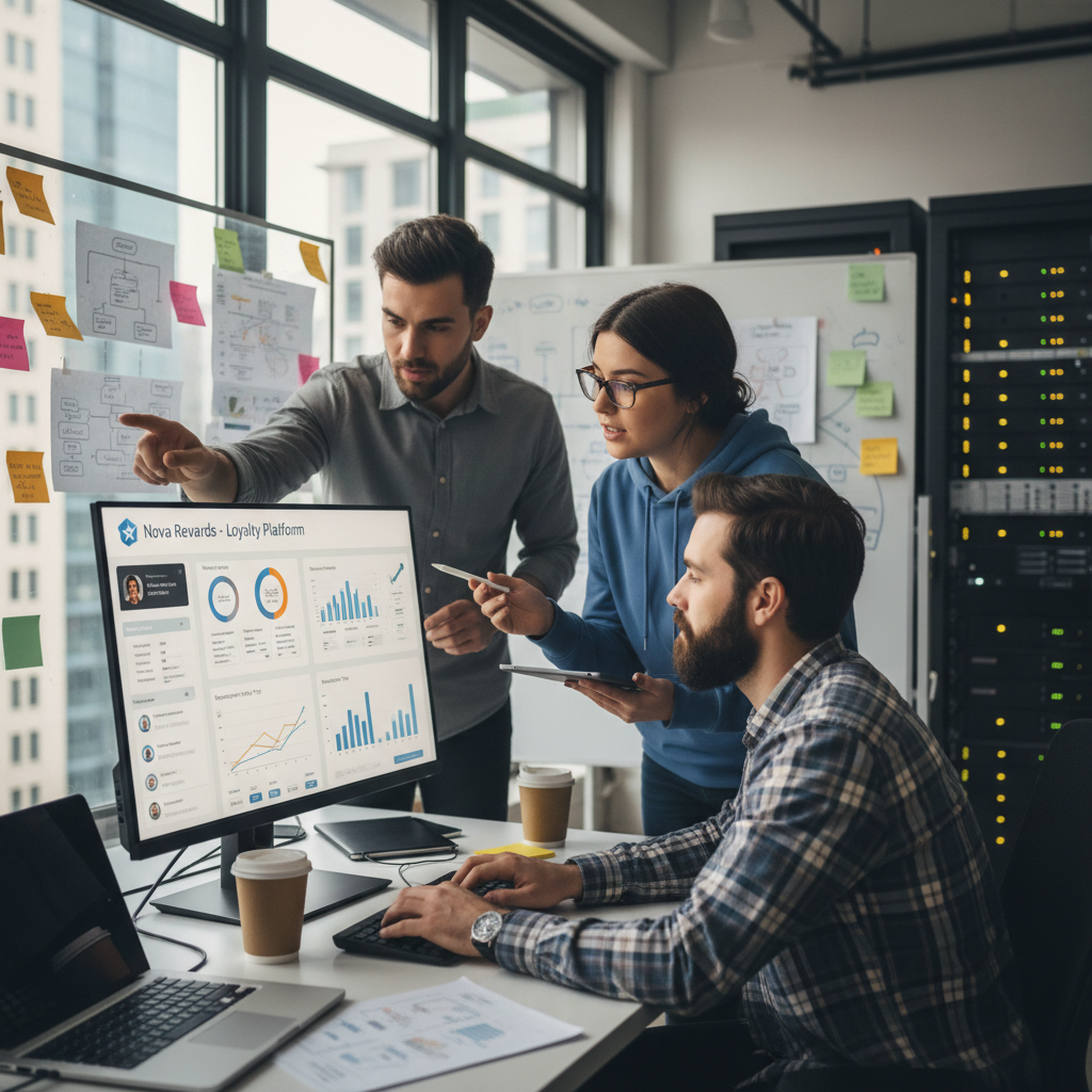 Photo: Tech and finance teams collaborating on the architecture of a loyalty program, highlighting the high-stakes planning behind points systems.