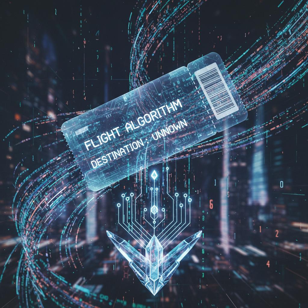 Alt text: Abstract art showing data streams converging toward a flight ticket, symbolizing complex flight search algorithms in action