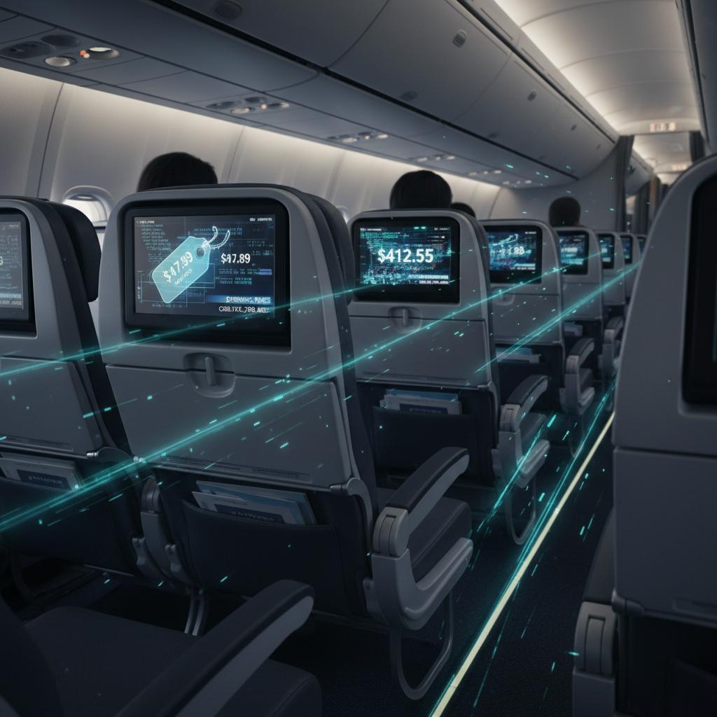 Dynamic pricing algorithm visualized with airline seats and data streams, illustrating the smart airfare data landscape.