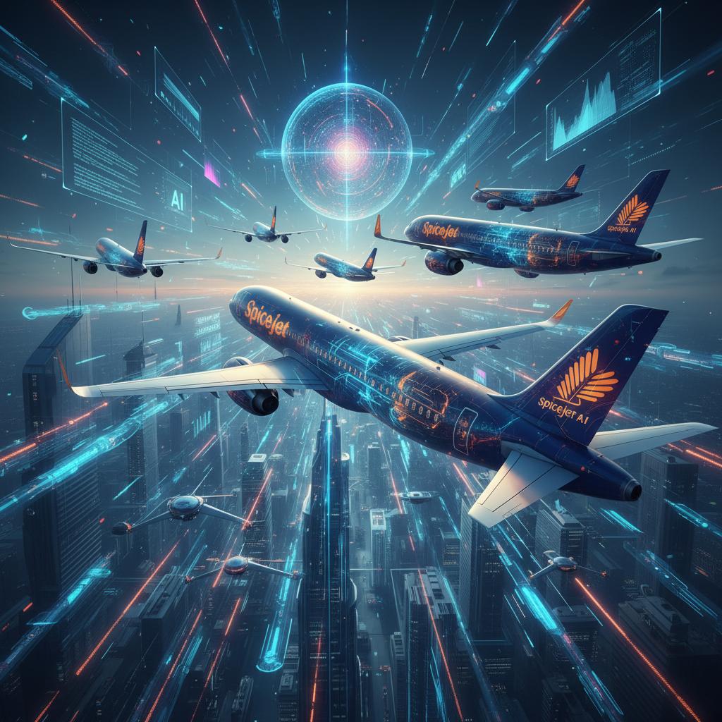 Alt text: SpiceJet airplane overlaid with digital flight data graphics, representing AI future.