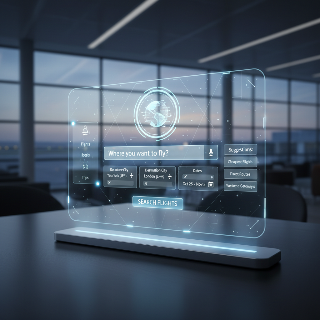 Alt text: Futuristic AI dashboard for flight booking with smart chatbot, representing stress-free flight booking with intelligence and personalization