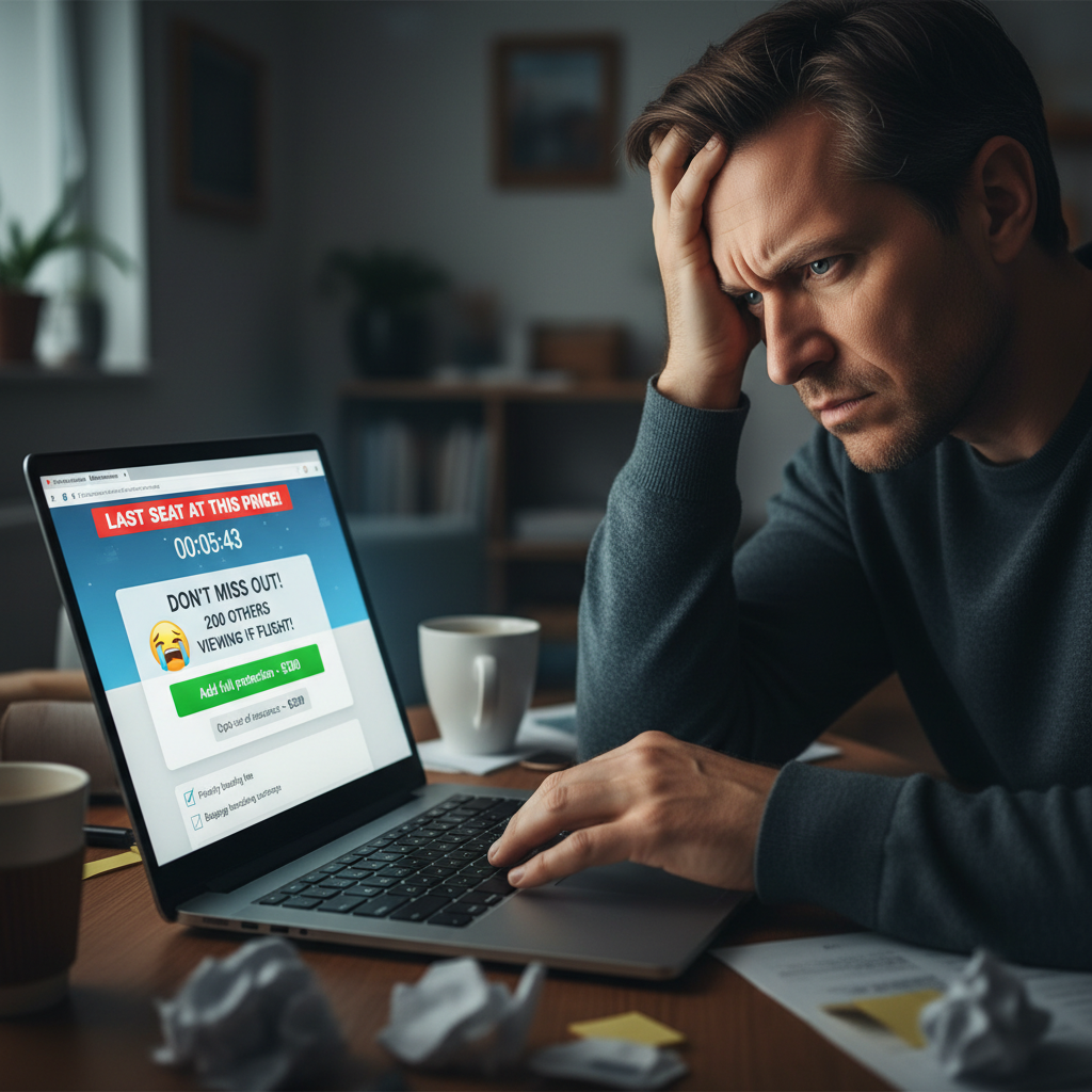 Search engines aren’t just inefficient—they’re often engineered to maximize your anxiety. “Dark patterns”—manipulative UX tricks like fake scarcity (“Only 1 seat left!”) and constantly shuffling prices—fuel a perpetual state of FOMO. According to a Business Insider investigation, 2023, these tactics not only erode trust but also systematically drive up final booking prices through psychological warfare.