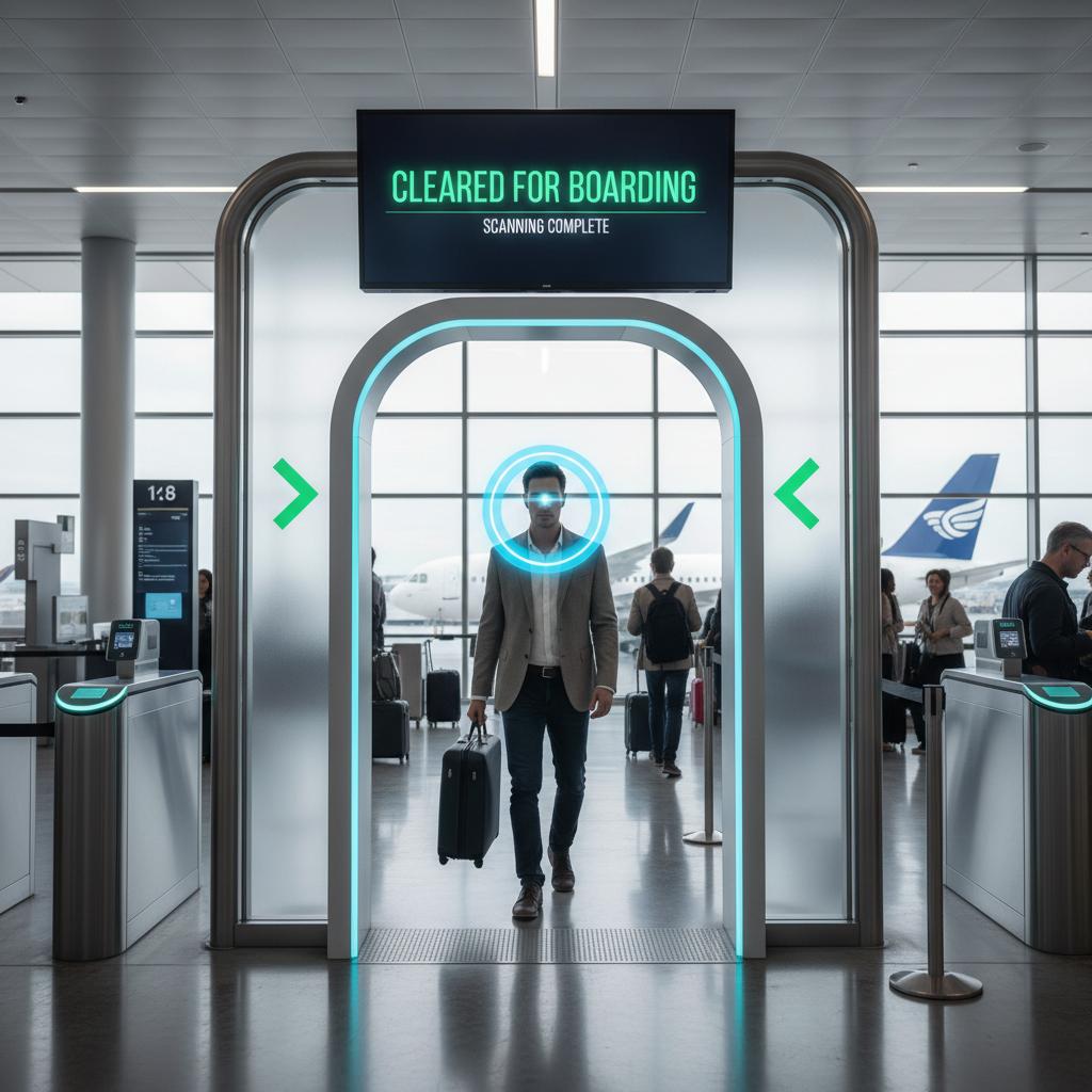 Facial recognition replaces boarding passes and ID checks. Your face or fingerprint becomes a digital key, used at check-in kiosks, security, and boarding gates.