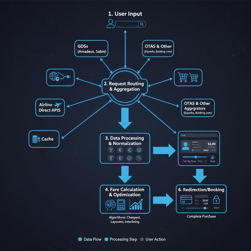 Engines like Kayak or Skyscanner that aggregate results from multiple OTAs and airlines, letting users compare options in one place.